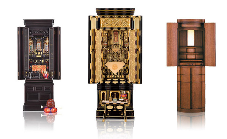 仏壇の種類は、金箔が施してある金仏壇、伝統的な唐木仏壇、マンションなどフローリングの洋間に合わせた家具調仏壇があります。